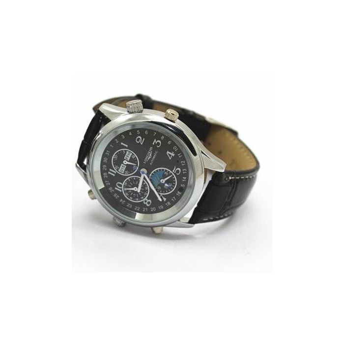 Spionkamera i klocka, 8 GB - silver/svart läderarmband med texturerad svart urtavla